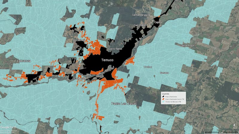 En el primer caso, el 29% de sus habitantes estarían en zonas que corresponden a títulos de merced, en especial en las expansiones hacia el norte de la ciudad y el sector de Labranza, totalizando 88.049 habitantes. Pero en la segunda comuna la situación es todavía más intensa: el 74% de todos sus vecinos, 61.763 personas, caen bajo esa circunstancia, entre ellas buena parte de las viviendas sociales construidas con patrocinio del propio Estado en las últimas décadas. Entre ambas localidades, casi 150 mil personas estarían viviendo al interior de un título de merced.