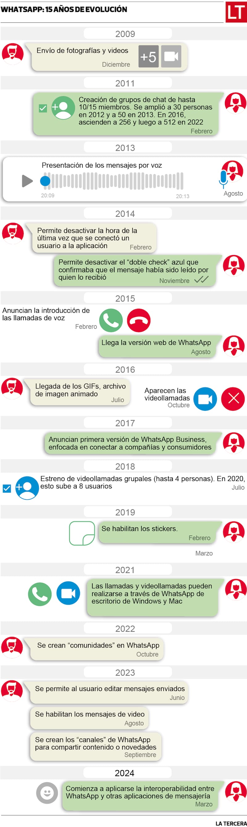 Con más de dos mil millones de usuarios en 180 países, WhatsApp ha generado todos estos años un nuevo código en la comunicación entre las personas y sus entornos, ya sean grupos de vecinos, de trabajo, amigos o apoderados. Su aplicación en diversos ámbitos de la vida la transformó en la aplicación de mensajería más utilizada en el mundo. Chile no es la excepción. Aquí, una línea de tiempo con datos, además de todos los cambios que ha sufrido WhatsApp durante la última década y media.