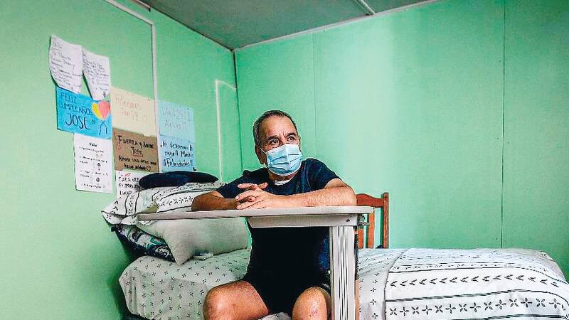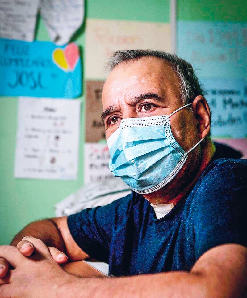 A José Miguel Torres (61) se le hace difícil no quebrarse cuando relata lo que ha vivido los últimos 10 meses. Lo hace sentado en su cama, desde la pieza de su casa, ubicada en San Joaquín. Aún no logra pararse solo, todavía no ha recuperado la masa muscular suficiente para volver a caminar. No puede hablar muy fuerte: la herida en la garganta que tiene cubierta con un parche blanco es una de las consecuencias que le trajo la traqueotomía, y eso hace que su voz aún no esté 100% recuperada. Tampoco lo están sus pulmones, por lo que a ratos se toma pausas y, de a poco, empieza a hablar de nuevo.