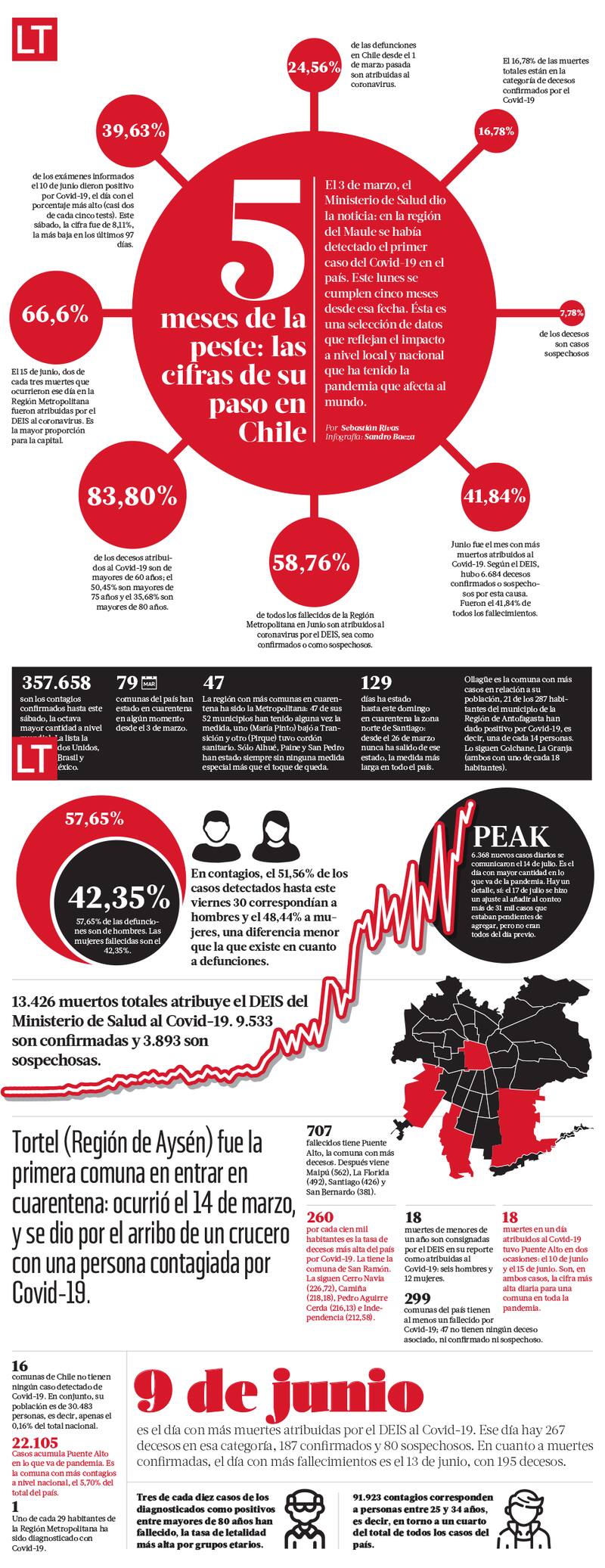 El 3 de marzo, el Ministerio de Salud dio la noticia: en la región del Maule se había detectado el primer caso del Covid-19 en el país. Este lunes se cumplen cinco meses desde esa fecha. Ésta es una selección de datos que reflejan el impacto a nivel local y nacional que ha tenido la pandemia que afecta al mundo.