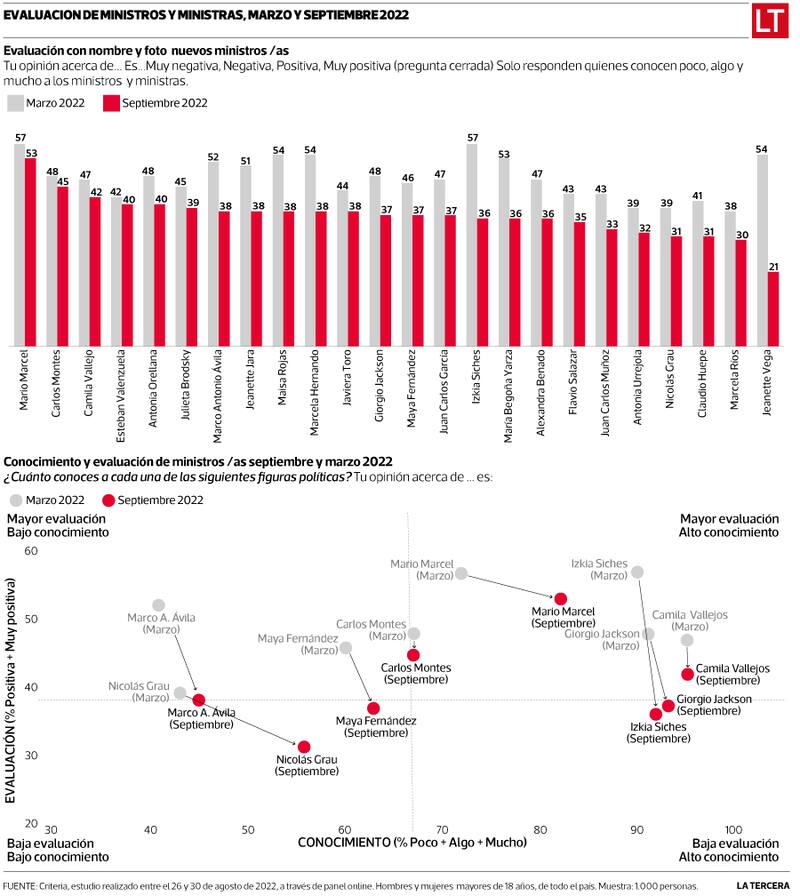 Maya Fernández, en Defensa (37%); Flavio Salazar, en Ciencias (35%); Juan Carlos Muñoz, en Transportes (33%), y Alexandra Benado, en Deportes (36%), muestran también importantes pérdidas en la valoración de un gabinete que eventualmente cambiará tras el plebiscito de este domingo.