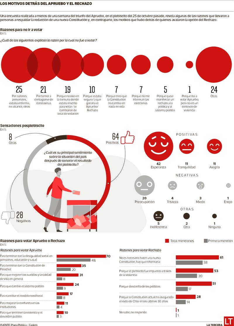 La postura fue mayoritaria. Siete de cada 10 personas que votaron a favor del Apruebo en el plebiscito del pasado 25 de octubre lo hicieron motivadas por “terminar con la desigualdad social en pensiones, educación y salud”. Esa fue una de las conclusiones a las que llegó la última encuesta realizada por la empresa Cadem y Plaza Pública, para conocer las razones que tuvieron los 7,5 millones de personas que llegaron a las urnas.