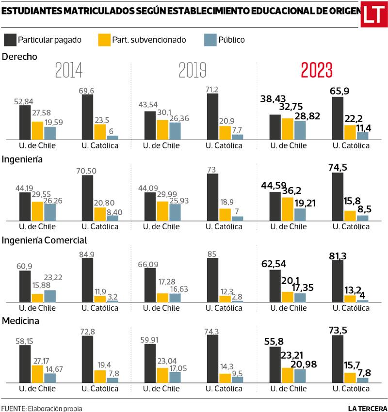 En la Universidad de Chile, tanto en Ingeniería Civil como en Comercial, disminuyó la presencia de estudiantes de establecimientos públicos. En el caso de Medicina y Derecho, aumentó. En Civil la disminución fue mayor, de un 7,05% en la última década. Y, por otro lado, el 44,59% de sus alumnos viene de colegios particulares. Ingeniería Comercial también demostró una baja en alumnos de colegios públicos, de 5,87%. Y, en esta carrera, el 62,54% de sus alumnos matriculados en 2023 viene de establecimientos privados. En Medicina el escenario cambia, pues la cantidad de estudiantes de escuelas públicas aumentó un 6,31% y los privados disminuyeron en un 2,35%. Finalmente, en la carrera de Derecho se notó el alza más pronunciada, con un 9,23% en los públicos en la última década.