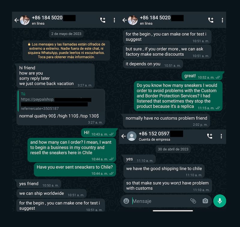 También en redes sociales como Instagram, TikTok o en YouTube son decenas las personas que publican videos con tutoriales sobre cómo comprar calzado pirateado o incluso venden el contacto de los proveedores más confiables. Y en páginas como PandaBuy o Yupoo basta un par de clics para hablar directamente por WhatsApp con vendedores en China, los que aseguran que han hecho varios envíos a Chile sin tener problemas con las revisiones de Aduanas en nuestro país.