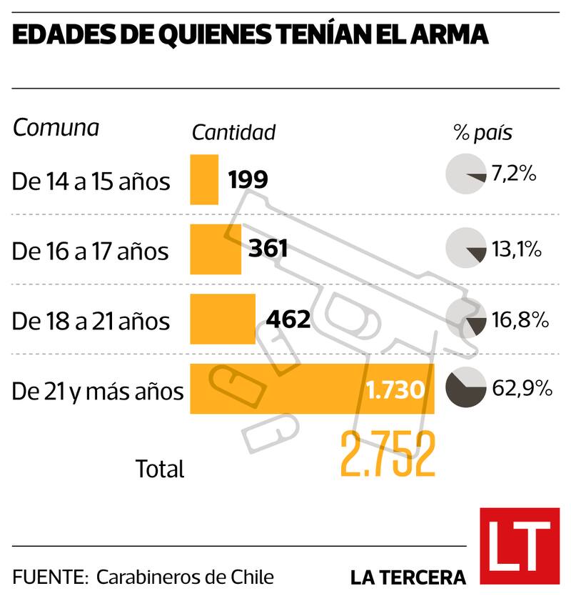 Entre el resto de la población, los datos aportados por la institución uniformada señalan que un segmento importante de un 16,8% (462) de las armas pertenecía a jóvenes de entre 18 y 21 años, mientras que un 62,9% (1730 armas) fueron descubiertas a adultos de 21 años o más.