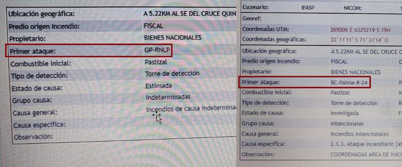 En efecto, registros iniciales de la plataforma Sidco de Conaf, que incluso fueron parte de una presentación que se realizó al ministro de Agricultura, Esteban Valenzuela, en Valparaíso el 13 de febrero pasado, muestran que el “primer ataque” al fuego fue realizado por “GP-RNLP”, en referencia a los guardaparques de la reserva, quienes sólo contaban con una antigua camioneta Nissan D-21 gris y un estanque de 500 litros de agua para intentar aplacar las llamas.