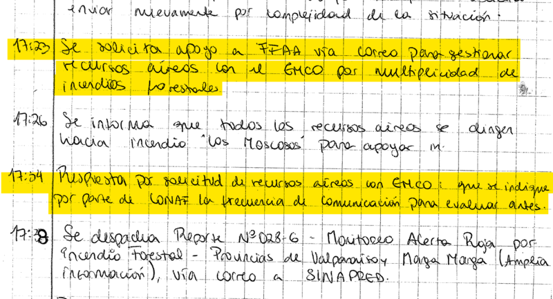 A las 17.23 horas del 2 de febrero, la bitácora de Senapred consigna que “se solicita apoyo a las FF.AA. vía correo para gestionar recursos aéreos con el Estado Mayor Conjunto (EMCO) por multiplicidad de incendios forestales”. Once minutos más tarde, a las 17.34 horas llega “respuesta por solicitud de recursos aéreos EMCO: que se indique por parte de Conaf la frecuencia de comunicación para evaluar antes”.