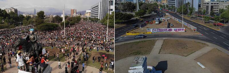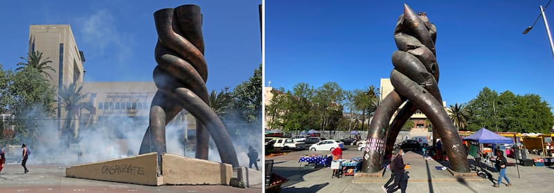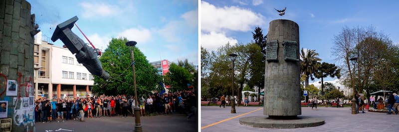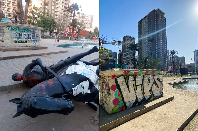 Cerrada durante meses por reparaciones, la Plaza de la Independencia reabrió en septiembre de este año. Sin embargo, la estatua de Pedro de Valdivia -derribada en noviembre de 2019- no ha sido reintegrada: se encuentra resguardada por la municipalidad, y el alcalde manifestó su intención de restaurarla y volver a instalarla en la plaza.