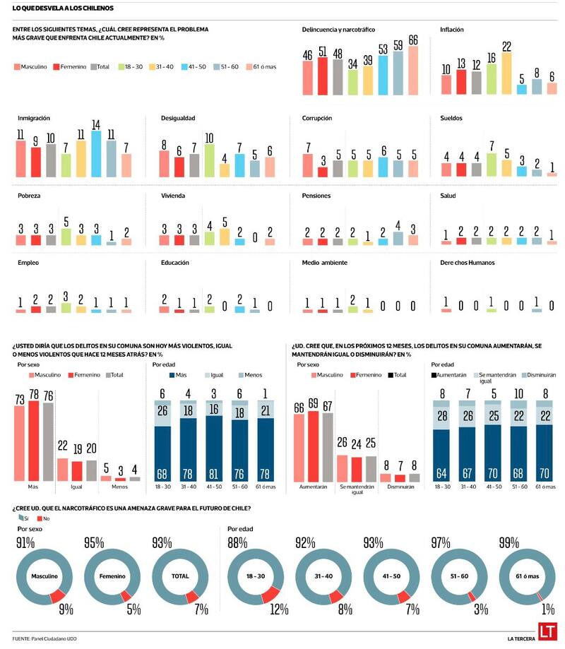 “Para aquilatar el orden de magnitud asignado, basta comparar con el segundo tema más grave consignado, esto es, la inflación. Es así que lo que sigue de los resultados es que la gravedad imputada a la delincuencia y narcotráfico es cuatro veces superior a la inflación, aun cuando esté en segundo lugar. Adicionalmente, esta diferencia de magnitud es semejante entre hombre y mujeres. No obstante, las mujeres consideran que la delincuencia es aún más grave, 51% versus los hombres 46%”, explica el documento de la UDD.