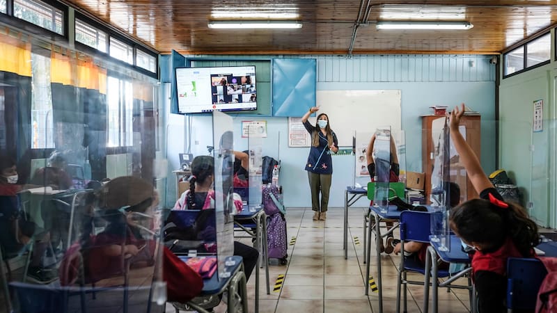 Si el año pasado el desafío para los miles de profesores fue hacer sus clases de manera telemática, este año para algunos su esfuerzo ha tenido que ser doble: lograr enseñarle a un grupo de niños que está presente en la sala y a otro que la sigue de manera online. El experimento, a pesar de sus beneficios, también conlleva costos.