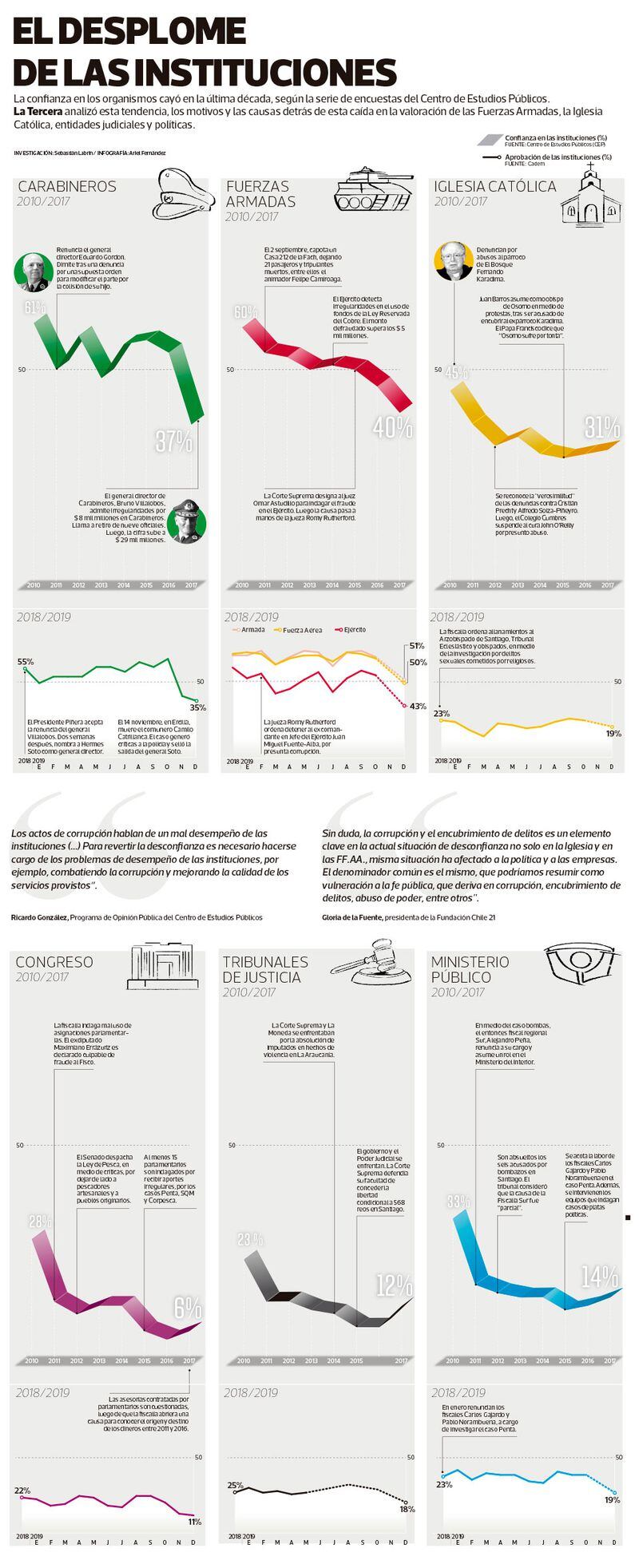 La confianza en los organismos cayó en la última década, según la serie de encuestas del Centro de Estudios Públicos. La Tercera analizó esta tendencia, los motivos y las causas detrás de esta caida en la valoración de las Fuerzas Armadas, la Iglesia Católica, entidades judiciales y políticas.