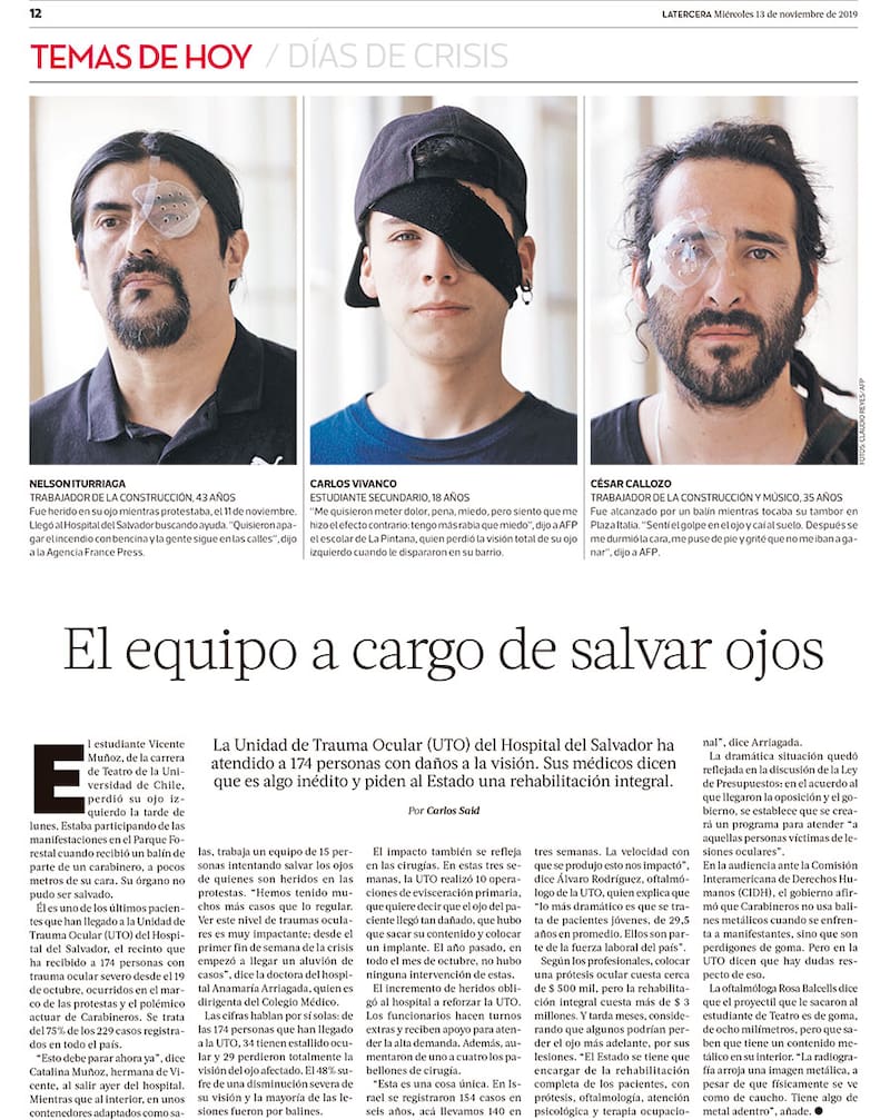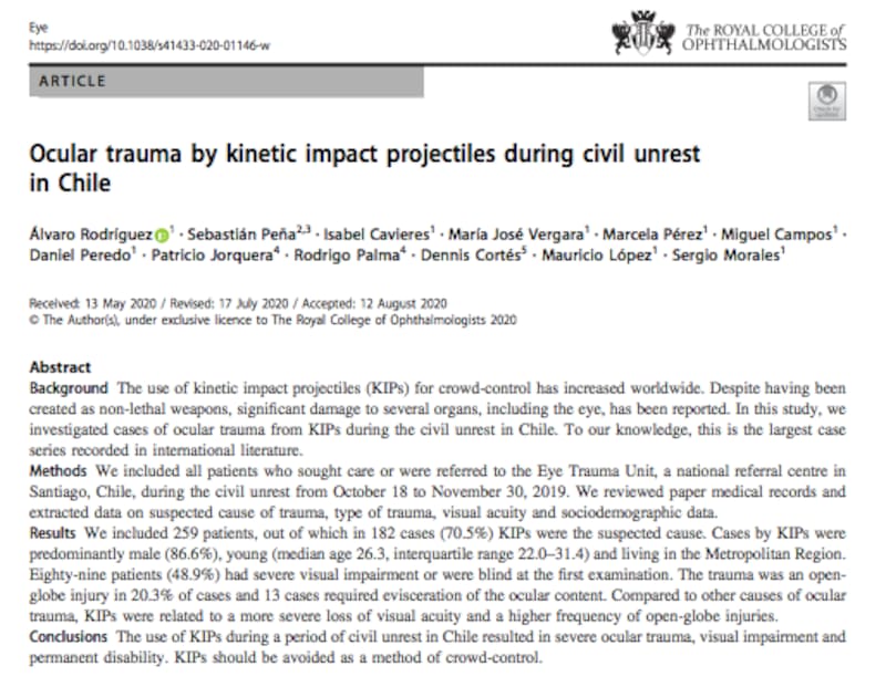 Lo que nosotros solíamos ver eran cuestiones relacionadas con drogas o que se producían en áreas de conflicto, como la Araucanía, por los perdigones de escopeta. Son lesiones de proyectiles pequeños de dos milímetros de diámetro. Pero lo de ahora fue algo absolutamente novedoso. Eran proyectiles de ocho milímetros de diámetro y que producían ya no perforación del ojo, sino que su estallido.