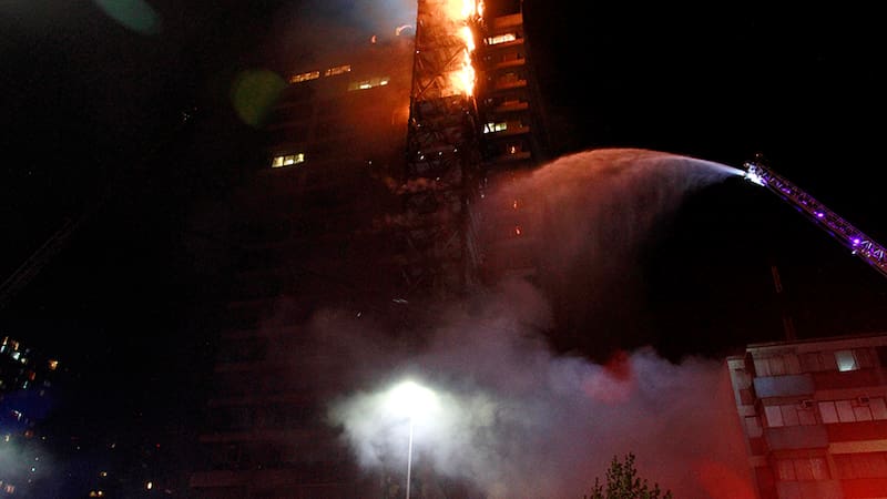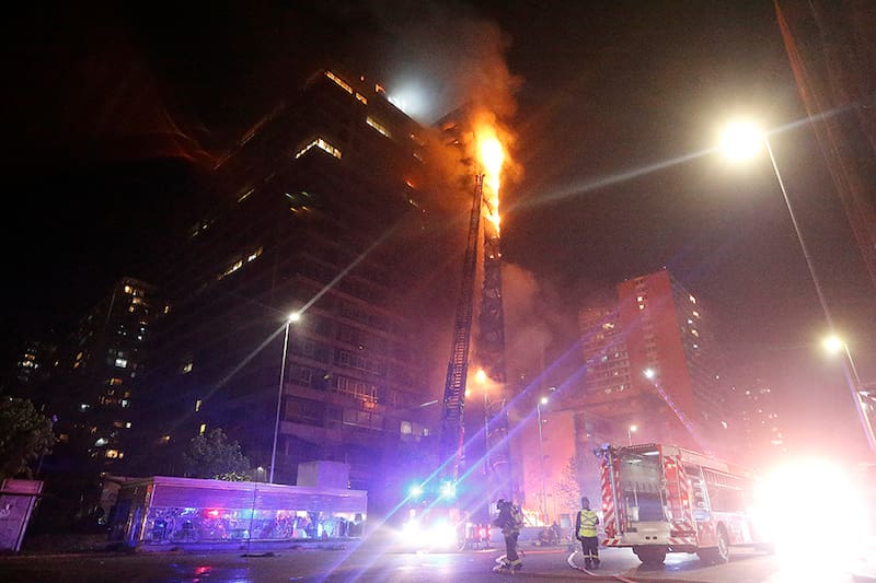 Pasadas las 21.50 horas de ese día, los distintos canales de televisión mostraban la construcción de 17 pisos teñida de naranjo, especialmente en el sector de la escalera de emergencia. En sólo 36 minutos el fuego se había apoderado del lugar, provocando importantes daños en bodegas y oficinas.