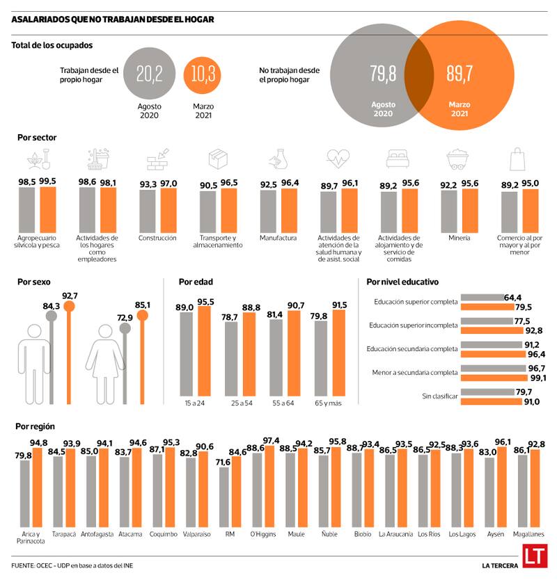 Según los datos de la Encuesta de Empleo del Instituto Nacional de Estadísticas (INE) informados esta semana, solo 10,3% de los asalariados ocupados trabajaban durante el propio hogar en el trimestre móvil enero-marzo. En el momento más duro de la pandemia, en agosto del año pasado, la cifra escaló a 20,2%, es decir, casi el 80% de los ocupados no trabajaba desde su hogar.