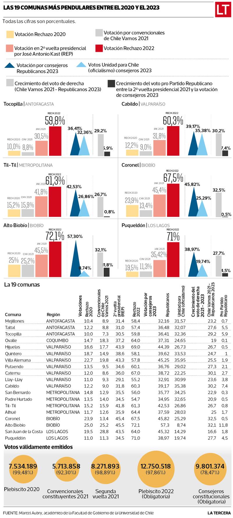 Así lo determinó el profesor Marcel Aubry, académico de la Facultad de Gobierno de la Universidad de Chile. El sociólogo comparó los resultados porcentuales de las 346 comunas del país, de cinco elecciones celebradas los últimos tres años: Plebiscito 2020, elección de convencionales constituyentes 2021, segunda vuelta presidencial 2021, Plebiscito 2022 y elección del Consejo Constitucional 2023.