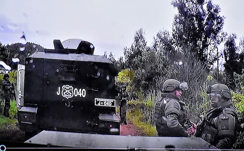 Desde el helicóptero se alertó que un tractor azul se aproximaba al equipo táctico. “Van en el tractor parece (...) Sí, ahí van los hueones en el tractor (...) Ahí iría el ‘37′ (sospechoso) más el conductor”, se escuchó en los mensajes radiales de la policía. El “37″ era Maikol Palacios Castillo, de 15 años.