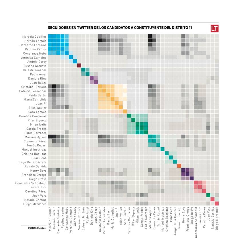 Un punto de interés que resalta Unholster es que existen cruces de seguidores entre listas. Por ejemplo, muchos que siguen a Mariana Aylwin también siguen a Cubillos, Larraín Matte y Fontaine, y algo menos a Bellolio. A la vez, una cantidad importante de los que siguen a este último candidato también siguen a Hernán Larraín Matte: pasa lo mismo con Patricio Fernández y algo menos con Paola Berlin.