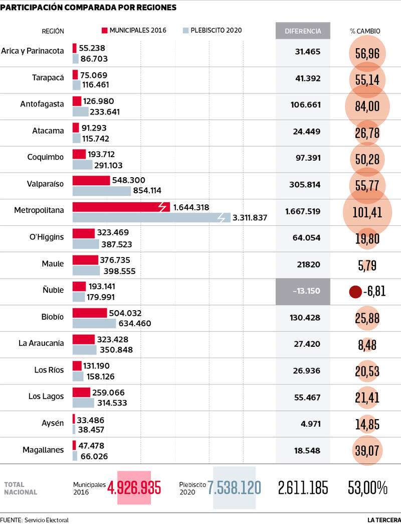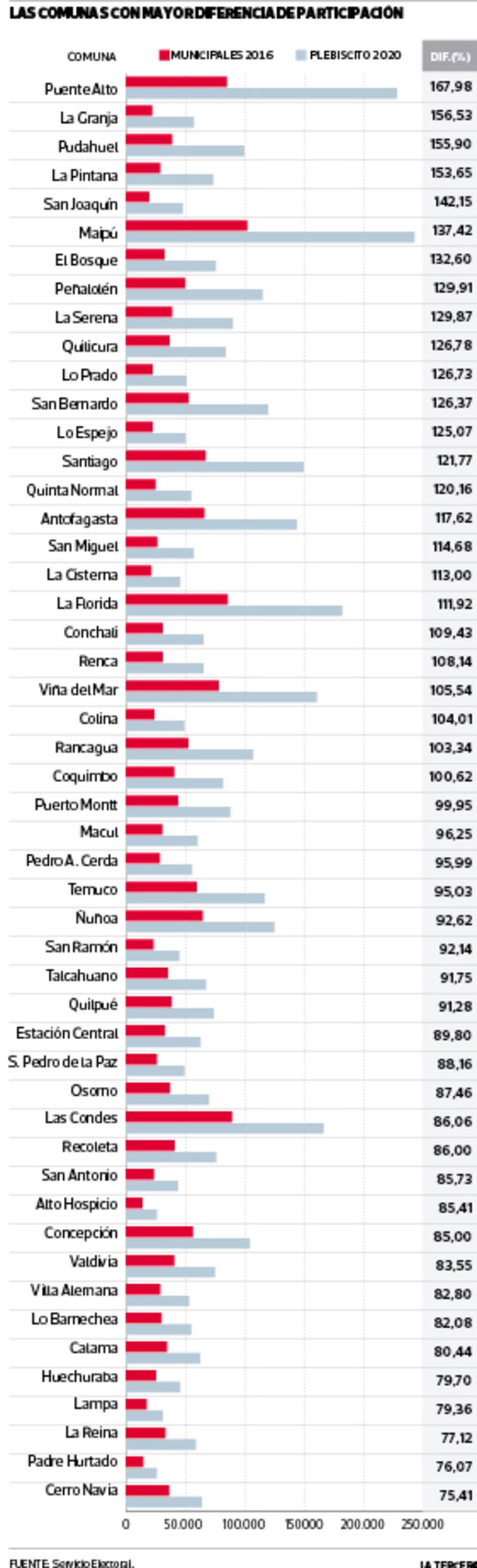 Siguiendo el mismo análisis, el alza sería especialmente significativa en la Región Metropolitana, donde los votantes para el plebiscito más que duplicaron la cantidad de personas que participó en los comicios municipales previos. Un aumento que, además, es todavía mayor en comunas emblemáticas del Gran Santiago como Puente Alto, La Pintana, Maipú y Peñalolén: en la primera de ellas, por ejemplo, se pasó de 85.296 votantes en 2016 a 228.573 para el plebiscito del año pasado.