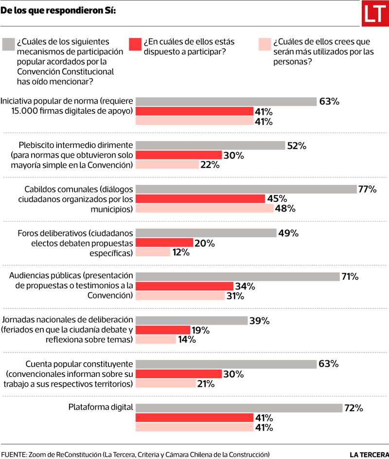 Y entre quienes sí han oído hablar de los mecanismos de participación, al ser consultados sobre en cuáles de ellos estás dispuesto a participar, el primer mecanismo favorito son los cabildos comunales (45%), seguidos de las iniciativas populares de norma (41%) y la plataforma digital de la Convención (41%).