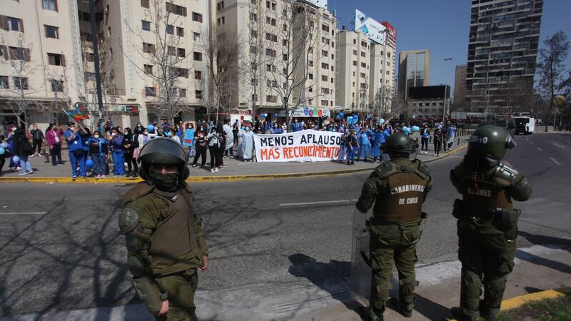 A pasos de Baquedano, los locales lucen abandonados, pero las veredas fueron repavimentadas y al llegar a la plaza, unas 100 personas se agrupan a la entrada del Teatro Universidad de Chile. La mitad son Técnicos en Enfermería en Nivel Superior (TENS). Una de ellas me cuenta que piden ingresar al Código Sanitario y se les reconozca como profesionales de la salud. “Nos sacamos la cresta, se necesitan menos aplausos y más cosas concretas”, resume.