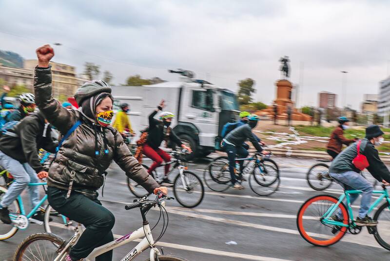 Bajo y les hablo a dos ciclistas que están a la espera de que llegue Carabineros para enfrentarlos. Cuentan que están enojados, porque “el pueblo no está en la calle como debiera, protestando”. Les digo que hay una pandemia. Se miran y se ríen. Alguien grita: “¡Cabros, ahí vienen!”. Alcanzo a entrar a mi edificio y sigo mirando desde mi terraza. El carro lanzaguas moja a algunos, vuelan los piedrazos hacia la policía y un manifestante se pone detrás de un furgón policial y alcanza a rayar “ACAB”, mientras otros lo aplauden. Esto se prolongará por 20 minutos, hasta que Carabineros se retire y, después de un rato, también los ciclistas.