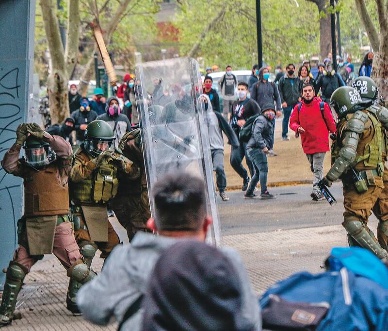 Hasta marzo, calle Ramón Corvalán Melgarejo era de batalla entre la “primera línea” y Fuerzas Especiales. Justo ahí vive Tomás Reitze. “La cuarentena récord no ha significado para mí tanto estrés como el día a día que me tocó vivir luego del estallido”, me escribe. “Gases lacrimógenos se sentían todos los días dentro de mi departamento; a veces me dejaba puestas la máscara y las antiparras en casa, pues al ser sordo, mis ojos se vuelven vitales. Cada vez que me ponía audífonos, fui acostumbrándome a los sonidos típicos de una peli de guerra a máximo volumen”, recuerda.