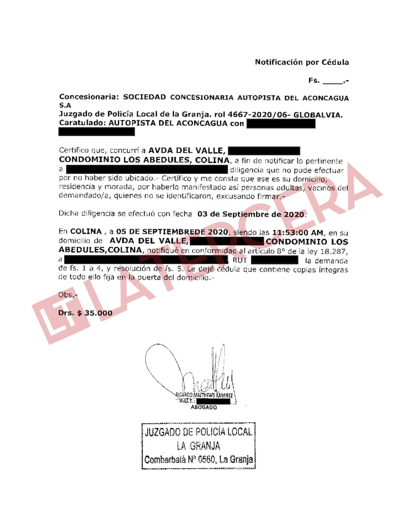 Más tarde, su ritmo de notificaciones alcanzaría altos niveles de eficiencia. Sin parar y con lapsos de tiempo que en algunos casos son de dos o incluso un minuto, entre las 11.53 y las 19 horas, Matthews tocó la puerta de 59 domicilios en Colina. En total, dijo haber notificado exitosamente a 45 demandados por Globalvía.