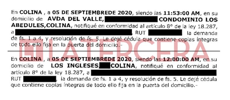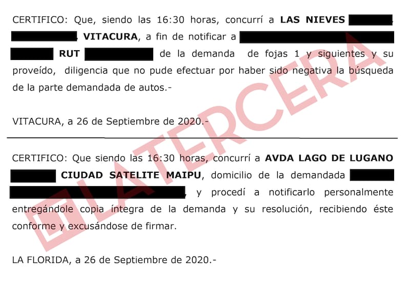 La incongruencia se repite a las 17 horas, cuando la mujer dice haber tratado de ubicar sin éxito a dos personas distintas, una en el Pasaje Isaías de Maipú y otra en calle Tupungato de Vitacura. Pese a los errores evidentes, la calidad de “ministra de fe” de Romero validó las diligencias. Ese 26 de septiembre, Jessica Romero cobró $ 560 mil por todas las notificaciones.