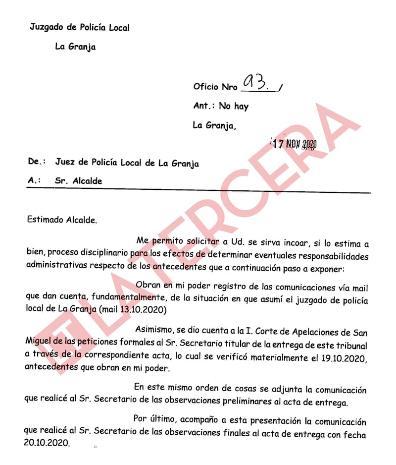 El 17 de noviembre de 2020, dos meses después de llegar al cargo, el juez Ongaro asegura que envió al alcalde Delpin el Oficio N°93. “Me permito solicitar a Ud. se sirva incoar, si lo estima a bien, un proceso disciplinario para los efectos de determinar eventuales irregularidades administrativas respecto de los antecedentes que a continuación paso a exponer”, parte diciendo el documento.