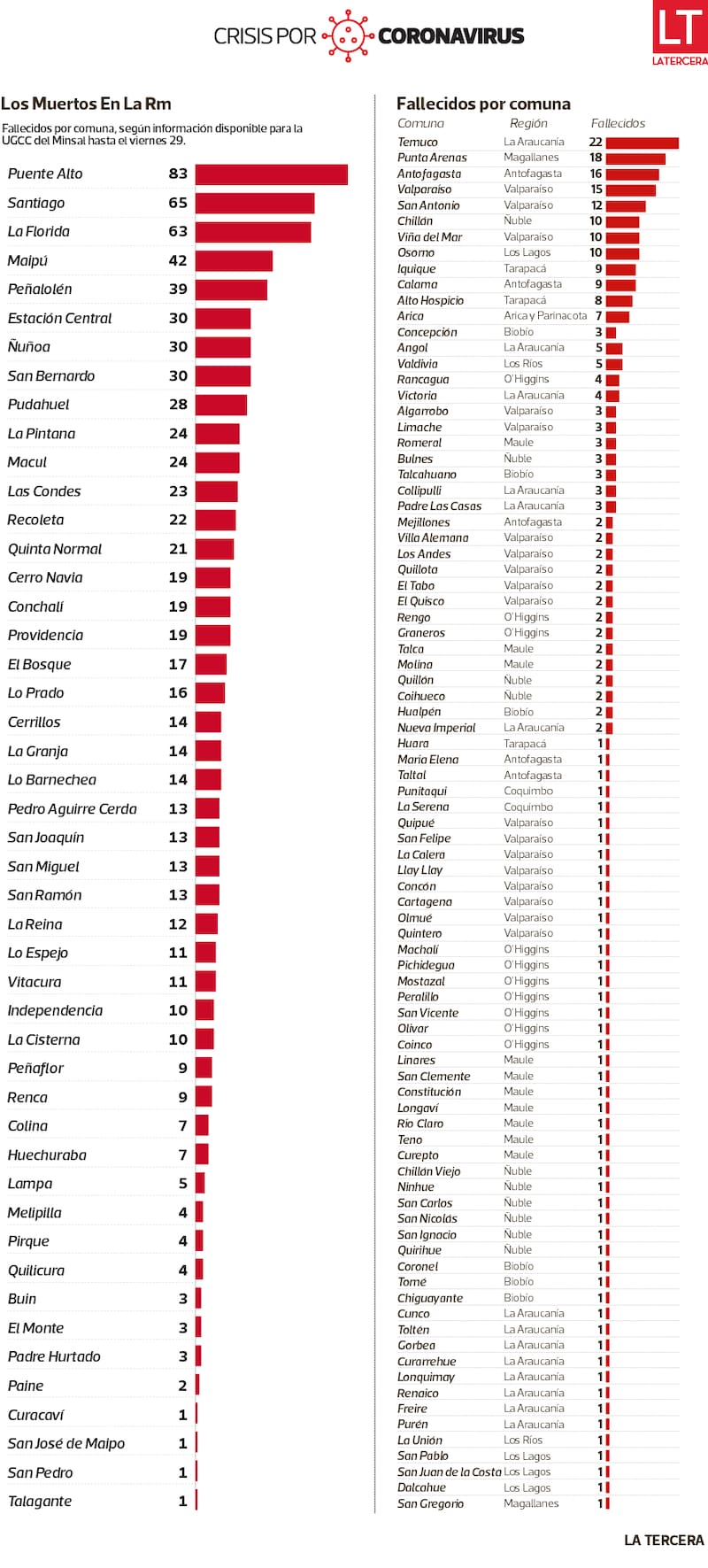 Pero La Tercera accedió a un documento interno del Minsal donde se desglosan los fallecidos por cada municipio de la capital, en que 47 de las 52 comunas aparecen con al menos una muerte. El listado, atribuido a la Unidad de Gestión de Camas Críticas (UGCC) del ministerio, refleja la información disponible hasta el viernes 29 en la noche. Según su contenido, Puente Alto es la comuna con la mayor cantidad de víctimas, con 83, seguida de Santiago, con 65; La Florida, con 63; Maipú, con 42, y Peñalolén, con 39.