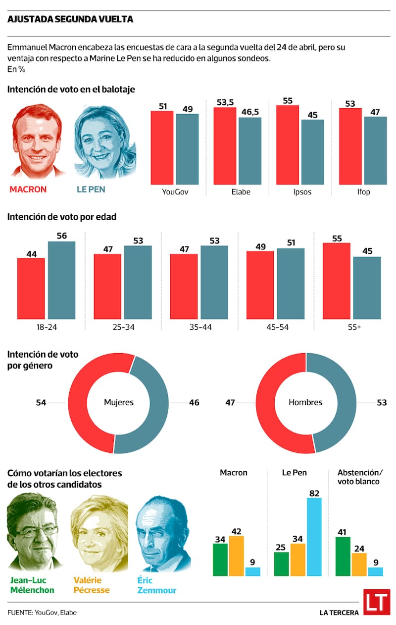 Daniel Boy, sociólogo electoral del Centro de Investigaciones Políticas de Sciences Po, en París, señala respecto de las posibilidades de Le Pen: “Las encuestas de intención de voto que ha habido hasta ahora para la segunda vuelta van entre 49% y 50%, el margen más estrecho que se puede tener. Por el momento, no hay ningún sondeo publicado que muestre a Marine Le Pen ganando, y siempre está a un punto o dos de Macron. Lo que quiero decir es que no es imposible que gane Le Pen, está en las posibilidades. Si los jóvenes no votan, porque no les agrada ni les importa Macron, eso podría abrirle la puerta a Marine Le Pen, no se descarta esa posibilidad”, dice a La Tercera.