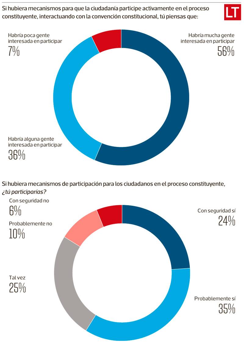 Una característica de los procesos constituyentes desarrollados en el mundo en las últimas décadas es la demanda por participar de manera incidente. La gente ya no está dispuesta a que su Constitución la elabore un grupo de representantes por más eruditos y bien inspirados que sean. Este ánimo por participar se refleja en la última encuesta donde más de un 63% se declara dispuesto o muy dispuesto a participar. Esperando en un 62% que esta participación sea incidente.