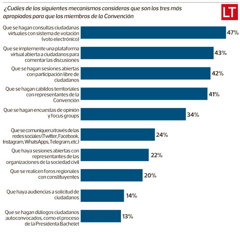 Lo que muestra la encuesta es que los mecanismos de participación al final son elementos que la ciudadanía considera bien importantes para acercarse a la Convención. De hecho los acepta como un vehículo para manifestar sus preferencias y que la Convención efectivamente los utilice en el proceso de toma de decisiones.