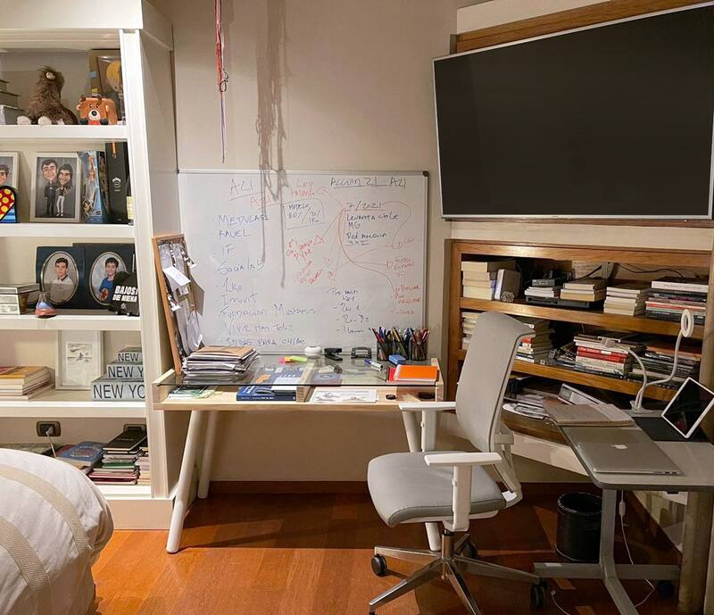 Pese a que siempre he trabajado mucho desde la casa, con la pandemia establecí mi propio rincón y espacio para el día a día. En mi caso, ocupo un escritorio que suele estar tan repleto y revuelto de cosas como la pizarra que tengo al frente, siempre llena de líneas, apuntes, ideas y papeles que cada cierto tiempo ordeno pacientemente.