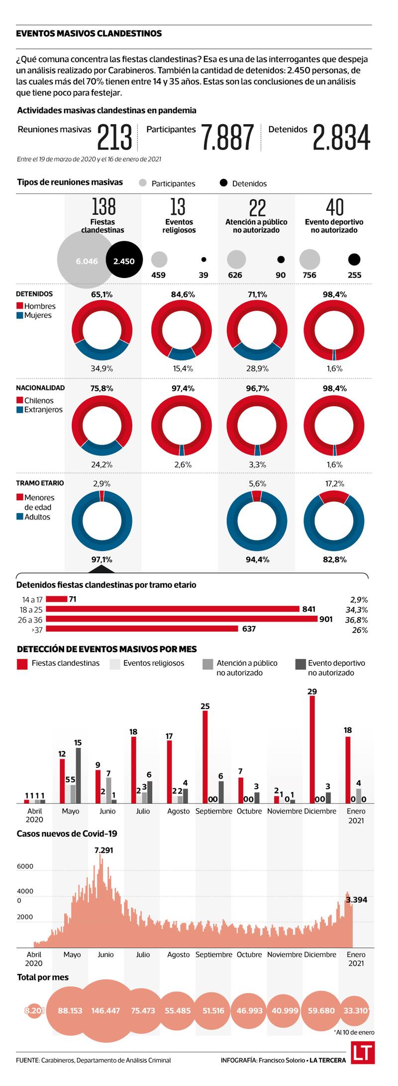 Según cifras del Departamento de Análisis Criminal de Carabineros (DAC), entre el 19 de marzo de 2020 y el 14 de enero de este año se detectaron 213 eventos masivos irregulares que reunieron a 7.887 asistentes y dejaron 2.834 detenidos. Ceremonias religiosas, encuentros deportivos irregulares, atención en locales comerciales que trabajan pese a no contar con los permisos, y una nueva tendencia al alza: las fiestas clandestinas. Estos son algunos de los principales focos de contagio que se esconden en la ciudad.