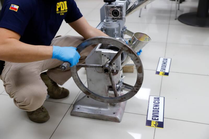 El comisario Patricio Navarro, jefe del Departamento de Investigación de Sustancias Químicas Controladas (Disuq) de la PDI, dice que en 2020 han encontrado cuatro máquinas de funcionamiento eléctrico, con capacidad de producción de 3.500 a 4.000 comprimidos por hora de trabajo. “Eso, sin contar lo que está vigente en investigación”.