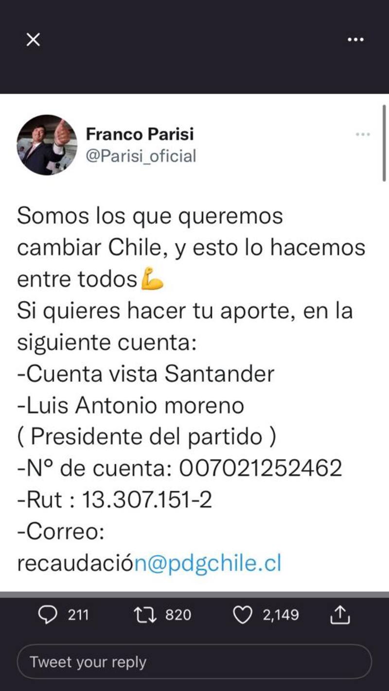 La primera alerta de que algo no andaba bien con las finanzas la dio -sin querer- el mismo candidato Franco Parisi. El 2 de septiembre posteó en su Twitter los datos de una cuenta vista del Banco Santander que pertenecía al presidente del PDG, Luis Moreno. “Somos los que queremos cambiar Chile y esto lo hacemos entre todos”, decía el post en el que invitaba a colaborar monetariamente con su campaña. El tuit más tarde se eliminó, pero Chile Transparente presentó una denuncia al Servel, que actualmente sigue en investigación. Ahí, Jorge Barrera, profesor de Derecho de la U. de Chile y la U. San Sebastián hace una advertencia: “Ese es financiamiento ilegal, los candidatos solo pueden recibir aportes en la cuenta especial que abre el Servicio Electoral”.