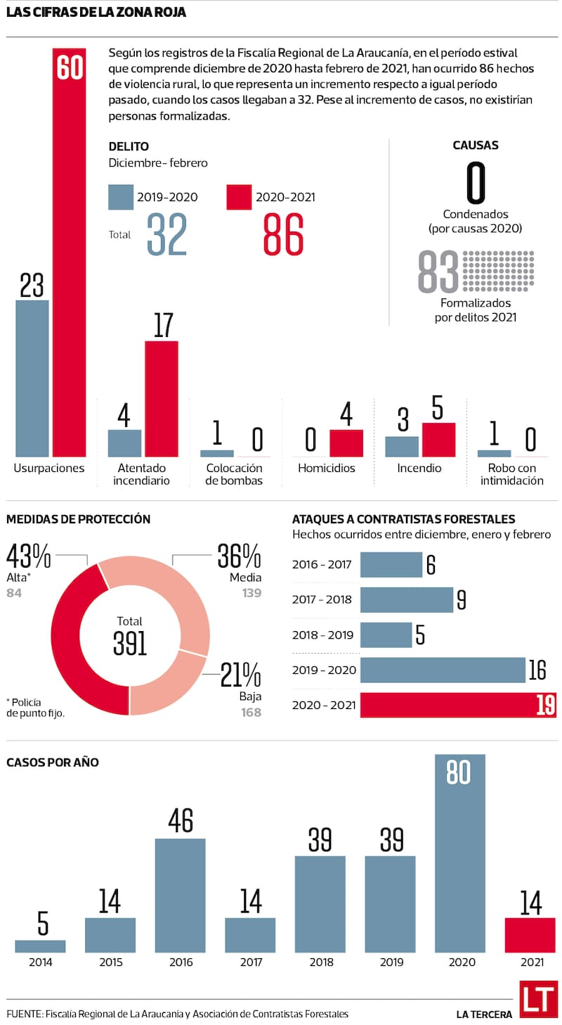 Según un informe del Ministerio Público de La Araucanía, “en el trimestre que comprende los meses de diciembre 2019 a febrero 2020 ocurrieron 10 hechos de violencia rural de alta connotación, mientras que en el segundo trimestre analizado -diciembre 2020 al 22 de febrero 2021- se tienen 26 hechos de este mismo tipo. Lo anterior en términos porcentuales implica un alza de 160%”, detallan. De acuerdo con el documento, los mayores incrementos de denuncias los agrupan los atentados incendiarios, que pasaron de cuatro durante el verano pasado a un total de 17 hasta los primeros meses de 2021. Las usurpaciones de terreno también muestran una tendencia al alza, al pasar de 23 casos a 60 en lo que va del año; es decir, un 161% de incremento, según las cifras del Ministerio Público.