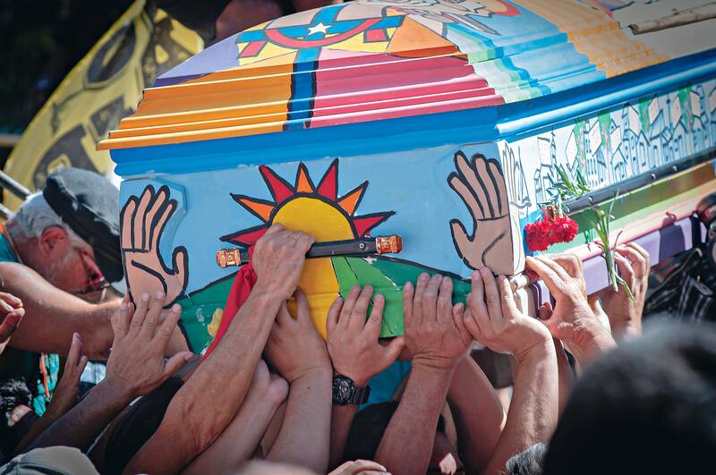 El domingo 14 de marzo fuimos con Martina, mi hija menor, a despedir a Mariano Puga desde La Plaza Los Héroes. Caminando, nos encontramos con el cortejo fúnebre, gente con lienzos y banderas en la Alameda. Tomé la foto en el momento en que el ataúd llegó a la Iglesia de San Francisco y lo bajaron de una pequeña camioneta para entrar a la ceremonia. Quien estaba ahí adentro había sido un buen hombre, preocupado de los derechos humanos. Lo había conocido en los 80 y, casualmente, mi hija también tenía una conexión especial: una de sus mejores amigas y su familia eran muy cercanas al cura. Tanto así que le pusieron Marianito a su hijo menor. Por eso Martina filmó y se lo envió a su amiga que vive en Alemania.
