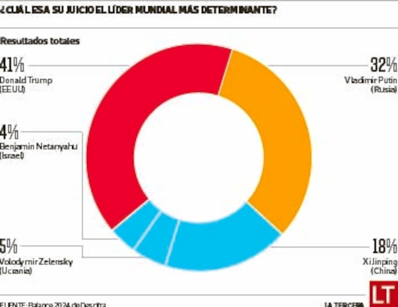 Para el 41% de los chilenos, según el sondeo de opinión pública Balance 2024 de Descifra, Donald Trump es el líder mundial más determinante en la escena global, seguido por el jefe de Estado ruso, Vladimir Putin (32%). Más abajo, en tercer lugar, con un 18% de las menciones, figura el líder chino Xi Jinping, seguido del mandatario ucraniano Volodymir Zelensky (5%) y del primer ministro israelí, Benjamín Netanyahu (4%).