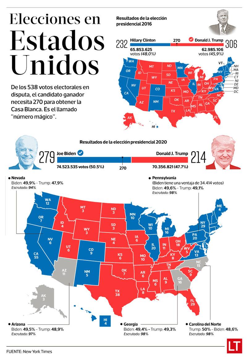Cuando aún no se confirmaba la tendencia irreversible en Pennsylvania, el equipo de campaña de Trump insistió el viernes en que “la elección no ha terminado”. “Las proyecciones erróneas que dan como ganador a Joe Biden se basan en resultados en cuatro estados que están lejos de ser definitivos”, aseguró Matt Morgan, del equipo del republicano, en un comunicado. Morgan hacía alusión, además de Pennsylvania, a Arizona (que reparte 11 votos electorales), Carolina del Norte (15 votos) y Georgia (16 votos), estados donde aún se contaban los votos y en los cuales –salvo Carolina del Norte- Biden tenía una leve ventaja. También se refería a Nevada, que ya confirmó a Biden como ganador, por lo que el candidato demócrata sumaba 279 votos electorales.