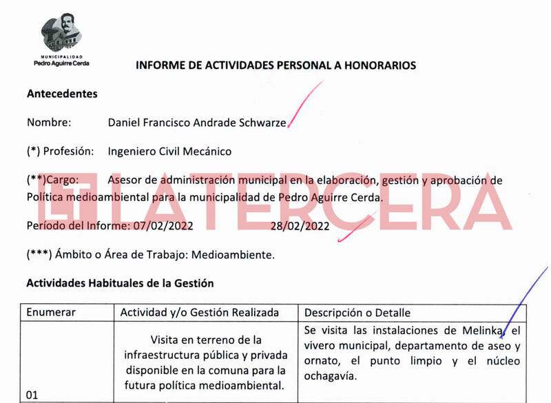 Según el contrato firmado con la Municipalidad de Pedro Aguirre Cerda el 7 de febrero de 2022, el ingeniero debía elaborar la nueva política medioambiental mediante un proceso participativo, “convocando a actores” y “articulando reuniones con diversas instancias comunales”. Para ello, Andrade no tenía obligación de ir presencialmente al municipio ni tenía control horario.