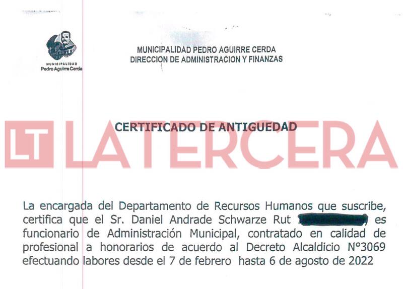 Desde el MOP también expresaron que entre los antecedentes que Andrade entregó para su contratación estaba un “certificado de experiencia laboral” emitido por la Municipalidad de Pedro Aguirre Cerda, el que daba cuenta de que había trabajado allí entre el 7 de febrero y el 6 de agosto de 2022. Pero nada dijo del segundo contrato con el municipio, el que se encontraba vigente al momento de unirse al MOP a jornada completa.