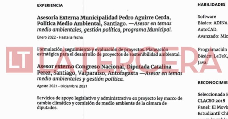 En el currículum que el exmilitante de RD entregó a la municipalidad para su contratación se consigna que entre agosto y diciembre de 2021 habría trabajado como “asesor externo del Congreso Nacional, diputada Catalina Pérez, Santiago, Valparaíso, Antofagasta”. Pérez en ese momento era pareja de Andrade y lo fue hasta que estalló el caso Democracia Viva, en junio pasado.