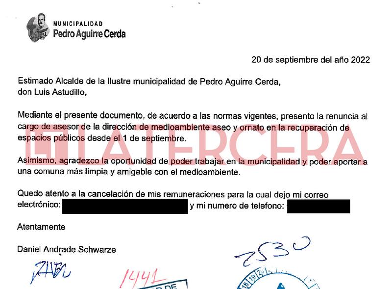 Recién el 20 de septiembre de 2022, el ingeniero envió una carta de renuncia dirigida al alcalde Luis Astudillo, en la que hacía efectiva su dimisión a contar del 1 de septiembre de ese mismo año. “Quedo atento a la cancelación de mis remuneraciones, para la cual dejo mi correo electrónico y mi número de teléfono”, escribió en la misiva.