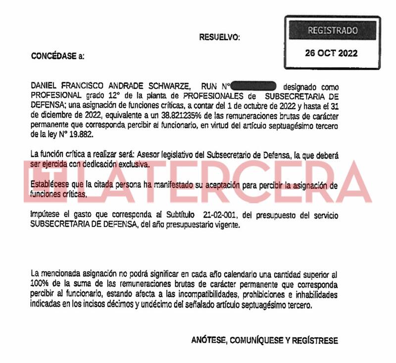 Para Andrade, la asignación significó por tres meses un aumento del 38,8% de las “remuneraciones brutas de carácter permanente”. Con ello, su sueldo bruto mensual rondaba los $ 3.000.000. Además del exmilitante de RD, en Defensa sólo recibían el bono siete jefes de división y el jefe de gabinete de Gaspar.