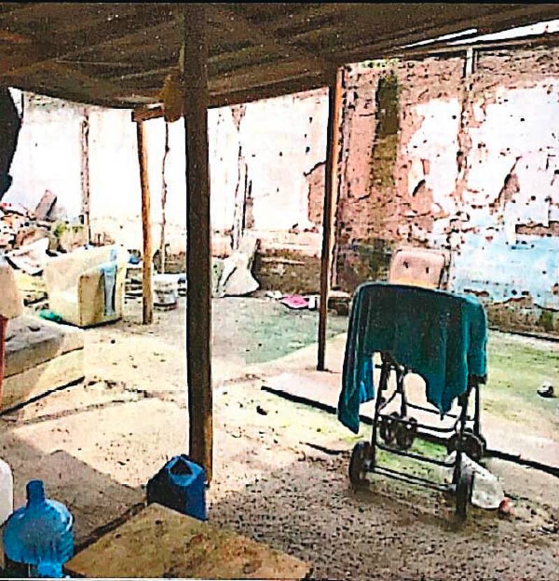 La casa blanca parece a punto de venirse abajo. Está protegida por un cerco negro cubierto por maderas y latas, alambres de púas y un candado con cadena. En el antejardín apenas sobreviven un árbol seco, un sillón viejo, un carrito de supermercado oxidado, una máquina de ejercicios de color rojo y muchos escombros apilados. Las puertas no tienen chapas y las ventanas están tapadas con sábanas. En el frontis, dibujado con un lápiz negro, se alcanza a distinguir el número de la calle.