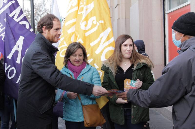 El viernes en la mañana fue el debut de este grupo en una actividad en la equina de Moneda con la Alameda, donde repartieron volantes del Rechazo, acompañados de jóvenes brigadistas con coloridas banderas.