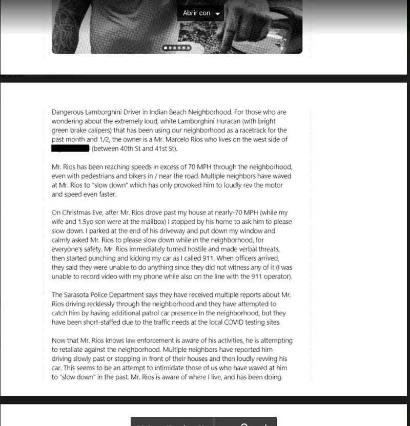 “Para aquellos que se preguntan sobre el extremadamente ruidoso Lamborghini Huracán blanco (con pinzas de freno de color verde brillante) que ha estado usando nuestro vecindario como pista de carreras durante el último mes y medio, el propietario es el Sr. Marcelo Ríos”.