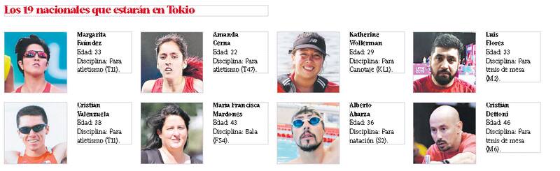 Este martes 24 de agosto se inaugurarán los Juegos Paralímpicos de Tokio. El Team ParaChile llega con una delegación de 19 deportistas y con buenas expectativas de sumar medallas, siendo los principales favoritos la lanzadora de bala María Francisca Mardones, la mejor del mundo en la especialidad; el pesista Juan Carlos Garrido y el nadador Alberto Abarza. A ellos se suman otras cartas muy interesantes, como la canoísta Katherinne Wollermann, quien fue cuarta en Río 2016, al igual que la atleta Amanda Cerna; el joven nadador Vicente Almonacid, actual número dos del ranking mundial, o la tenista en silla de ruedas Macarena Cabrillana, 11 del planeta, entre varios exponentes más, quienes ya demostraron su cuantía en Lima, donde la representación nacional terminó octava en el medallero, gracias a 10 oros, 12 platas y 11 bronces.